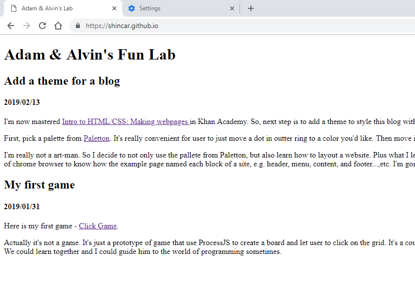 I'm really not a art-man. So I decide to not only use the pallete from Paletton, but also learn how to layout a website. Plus what I learned from Khan Academy, I know how to view source of a page. You could put "view-source:http://paletton.com/examples/webpage/index-white.html" in URL bar of chrome browser to know how the example page named each block of a site, e.g. header, menu, content, and footer...,etc. I'm going to take a snapshot of my current site and you could compare later when I make CSS work.